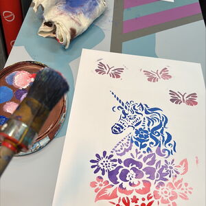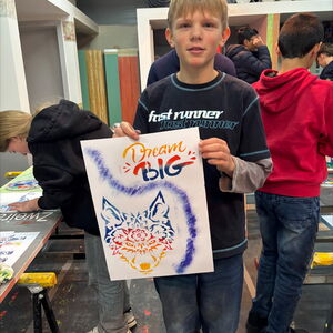 Neben einem Rundgang durch die Lagerhalle mussten in Teams Malerutensilien gereinigt werden. Außerdem durften die Schüler selbst ihrer Kreativität freien Lauf lassen und mit Farben und Vorlagen experimentieren.