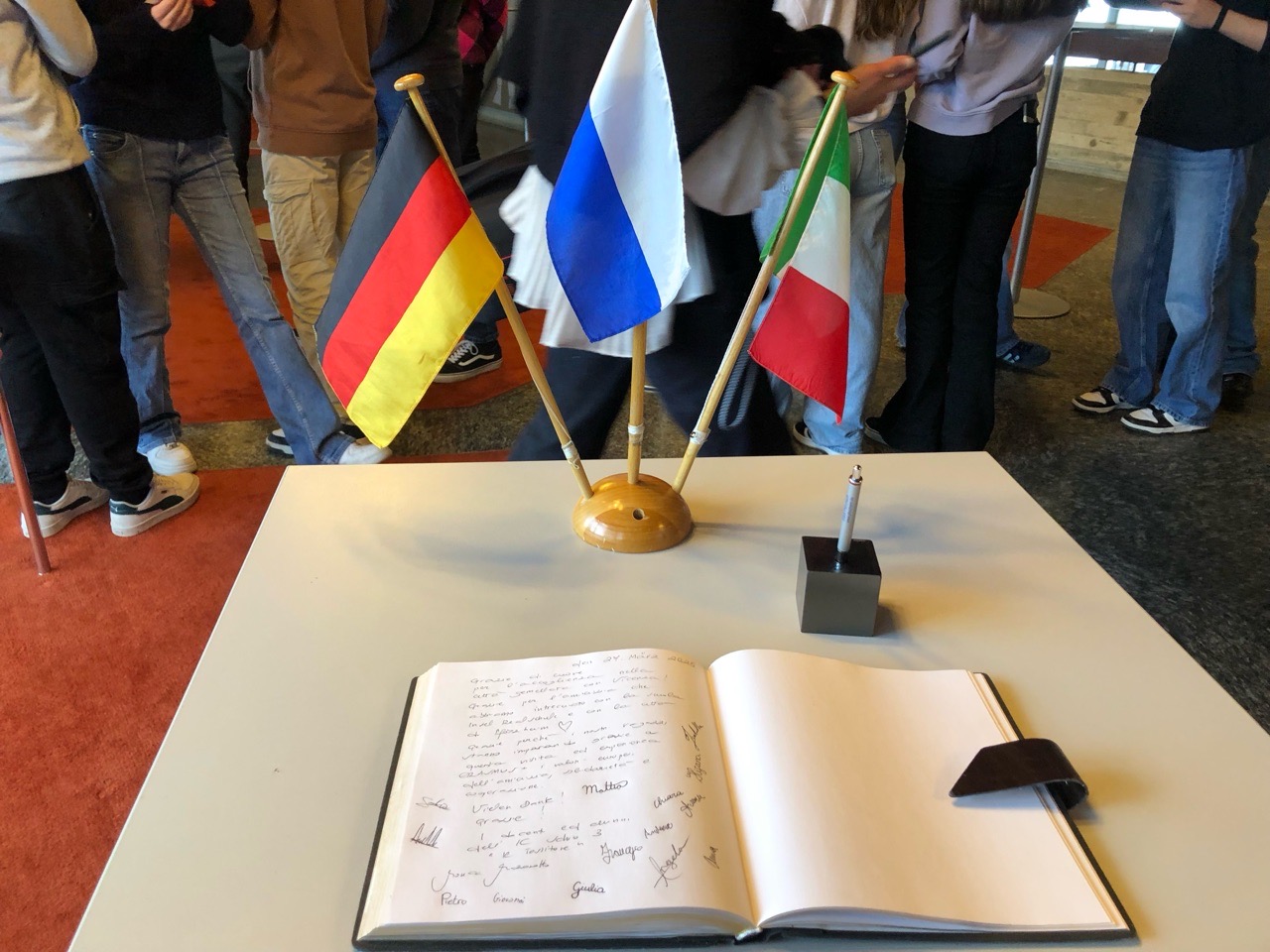 Am Donnerstag waren sie wieder bei uns in der Schule, hatten jedoch auch um 10 Uhr einen Termin mit dem Bürgermeister Herrn Fillbrunn, da Schio zur Region Vicenza gehört, welche eine der Partnerstädte Pforzheims ist. Am Nachmittag sind sie dann mit der Klasse 7b zum Gasometer, um dort die neue Ausstellung Amazonien zu besuchen.