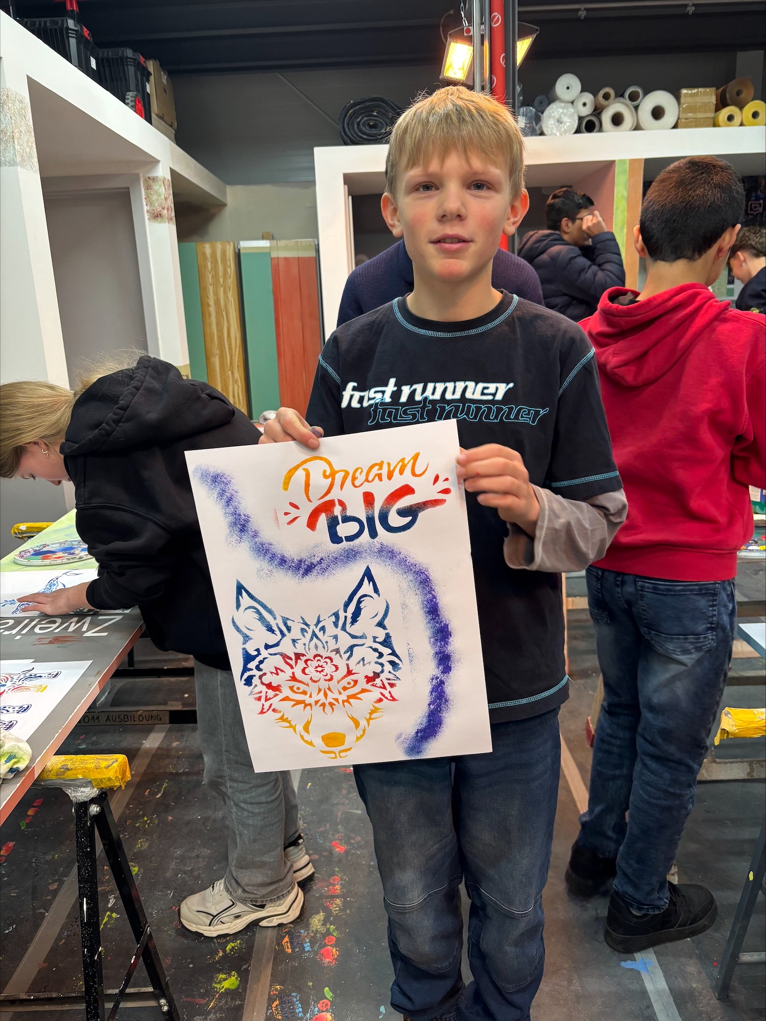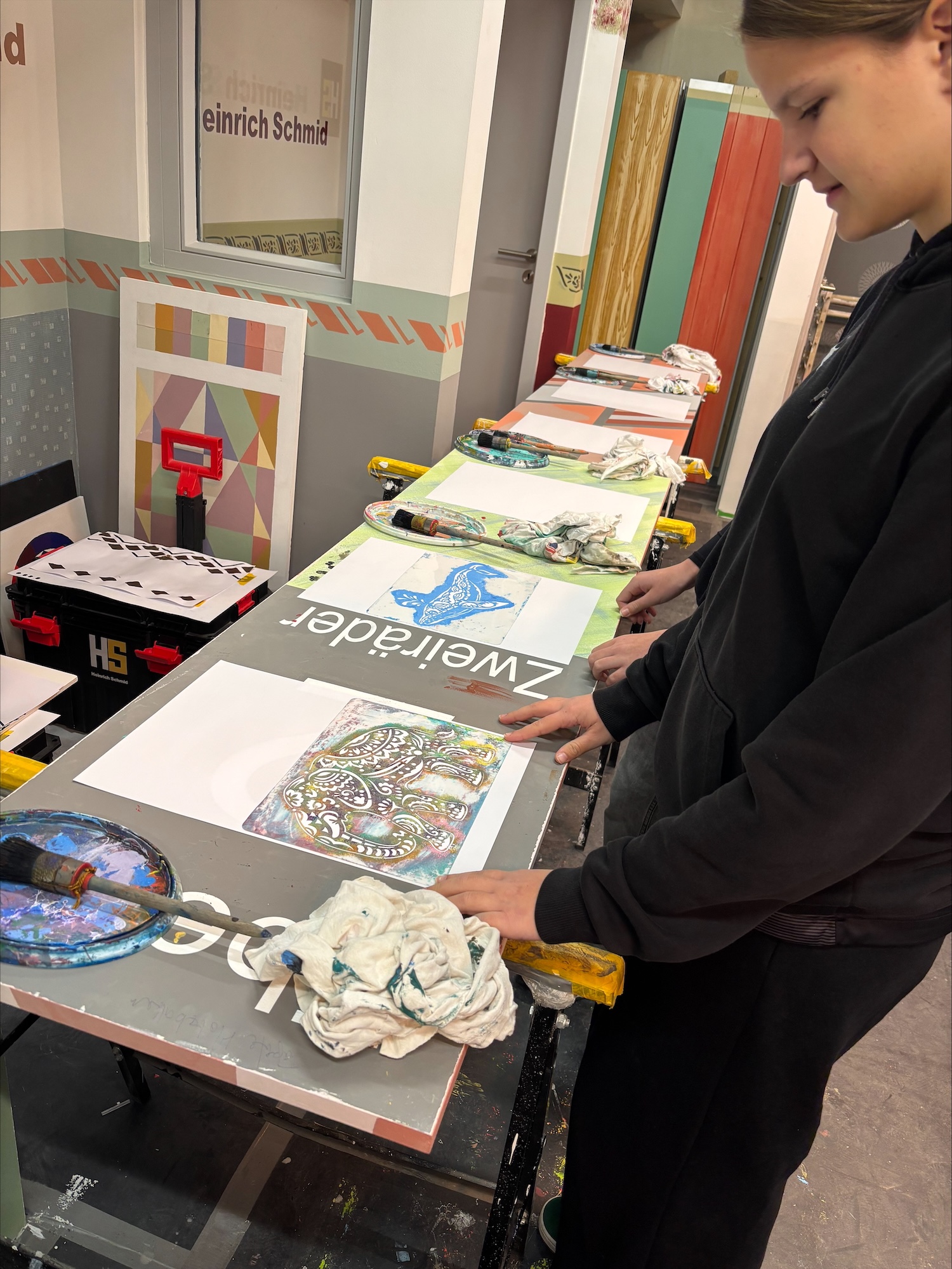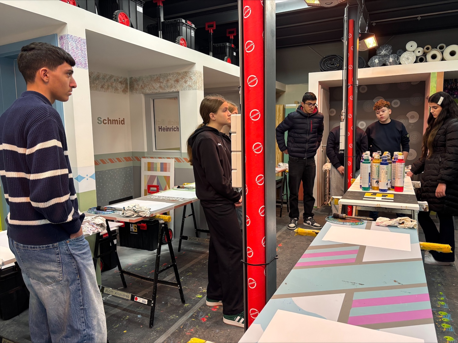 Neben einem Rundgang durch die Lagerhalle mussten in Teams Malerutensilien gereinigt werden. Außerdem durften die Schüler selbst ihrer Kreativität freien Lauf lassen und mit Farben und Vorlagen experimentieren.