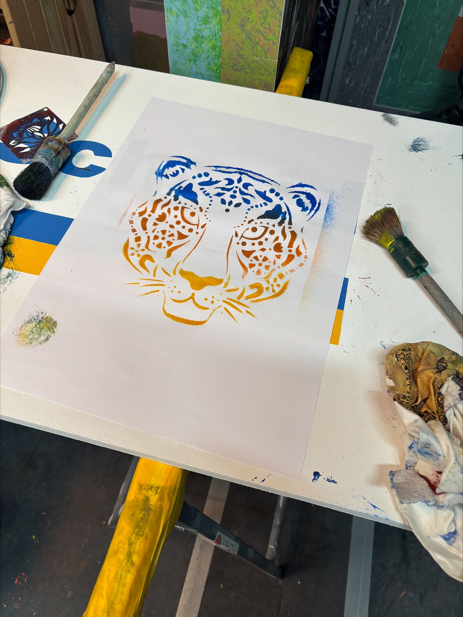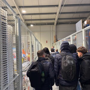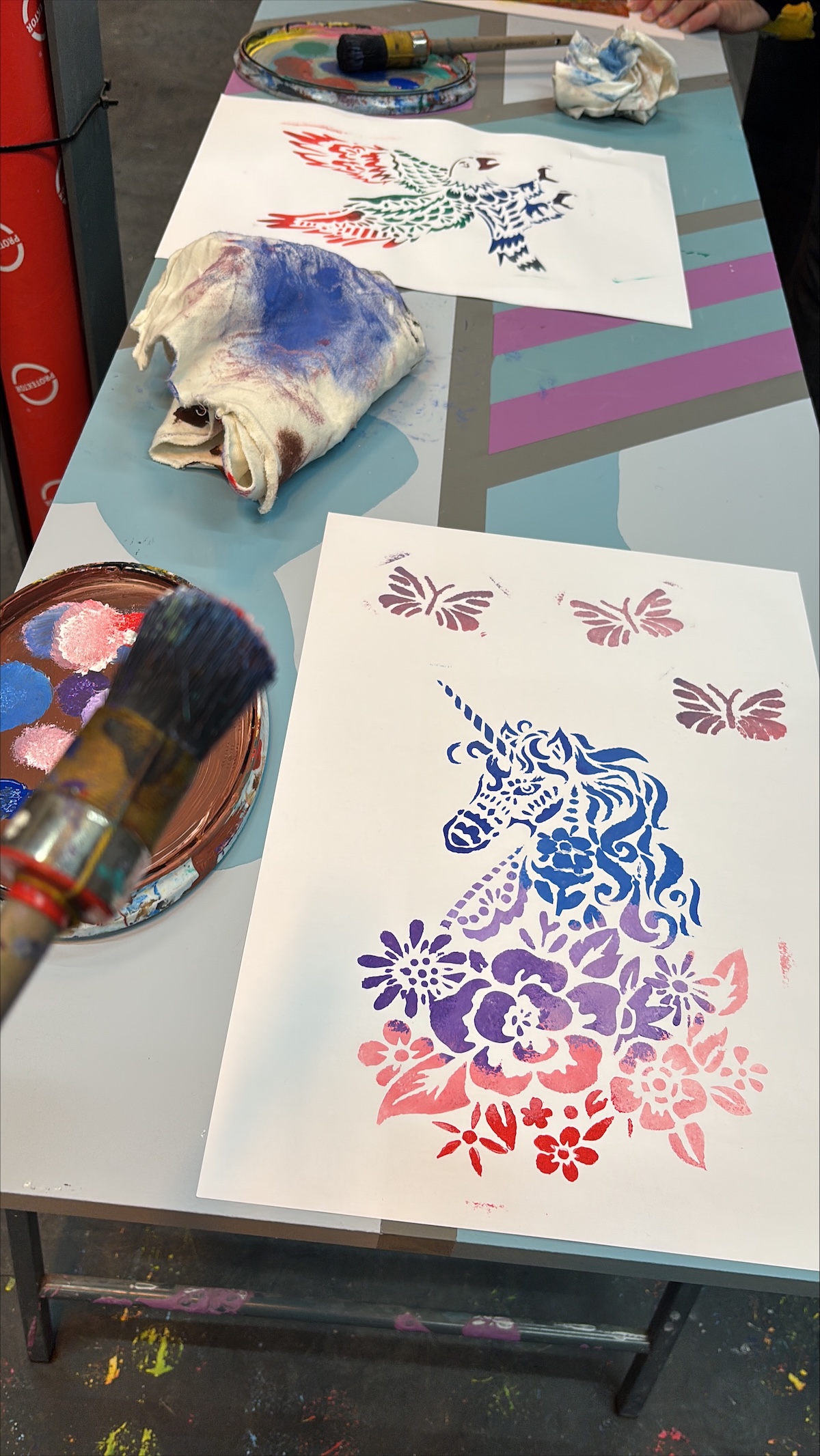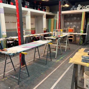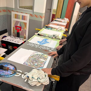 Neben einem Rundgang durch die Lagerhalle mussten in Teams Malerutensilien gereinigt werden. Außerdem durften die Schüler selbst ihrer Kreativität freien Lauf lassen und mit Farben und Vorlagen experimentieren.